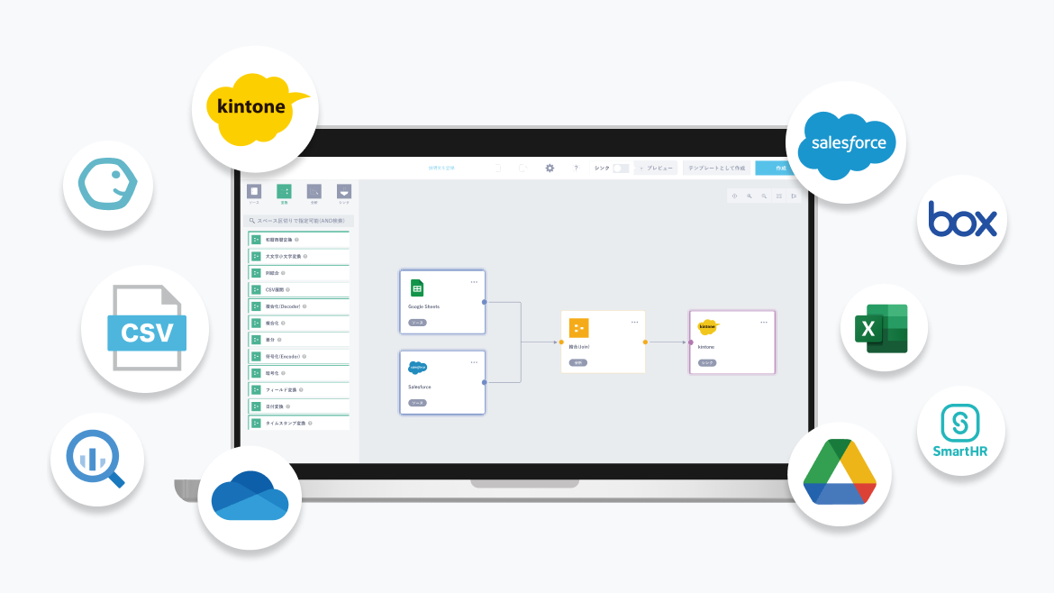 ETLツール(※)のため、kintoneと各種サービス/DB/ファイル等とのデータ連携自動化を実装可能。しかもノーコードかつ直感的な操作可能なUIで、エンジニア以外でも十分に利用できます。