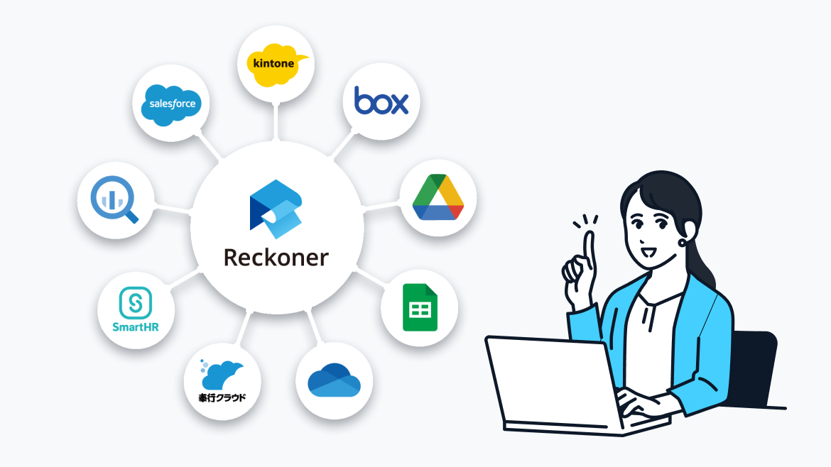 100種を超える様々なサービスのデータ連携をReckoner1つで実現可能。