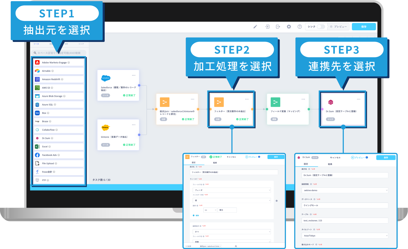 簡単3ステップ、連携サービスや加工処理をドラッグ&ドロップするだけで簡単構築。プログラム知識不要で、データ連携の流れも直感的に理解可能。